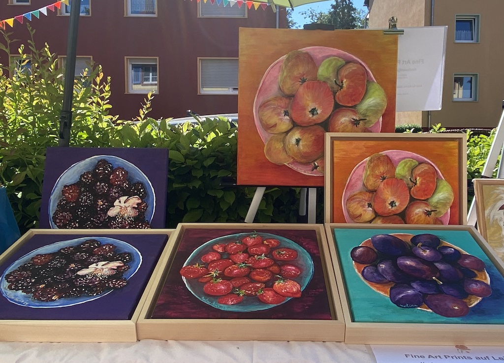 Beim Malen von Obst entdecke ich die feinen Details und Nuancen jeder Frucht. Die Details gestalte ich „abstrakter“ und freier. Doch eins ist mir dabei stets wichtig: Ich möchte mit den Bildern das Aroma und den Geschmack der Früchte auf die Leinwand übertragen. Das Obst wächst in meinen naturnahen Schrebergarten bzw. im Elterngarten „wild“, das heißt: Ich lasse die Früchte einfach gedeihen ohne mein Zutun. Jedes Jahr ernte ich zahlreiche Früchte.