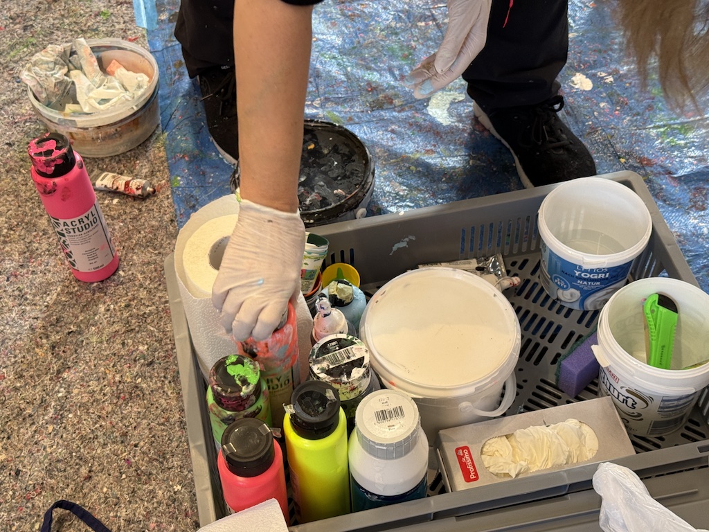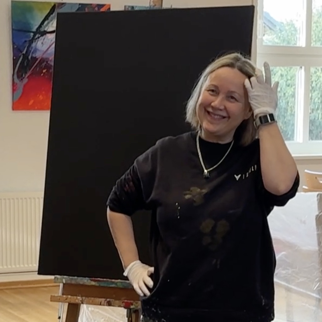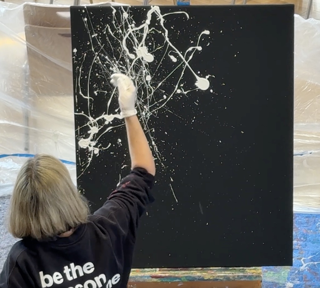 Éva trat vor die schwarze Leinwand, als würde sie in einen stillen, weiten Raum blicken. Mit ruhiger Hand schöpfte sie die Acrylfarben aus den Behältern und warf die Farben auf die schwarze Fläche – konzentriert und mit befreienden Schwung aus dem Handgelenk. Die Farbe löste sich, fand ihre Flugbahn, perlte rhythmisch auf der Leinwand auf. Es entstanden lineare und punktförmige Spuren, die den Ablauf der Technik präzise sichtbar machten. Jeder Farbauftrag zeigte deutlich, wie Richtung, Abstand und Schwung den Charakter der entstehenden Oberfläche bestimmten.