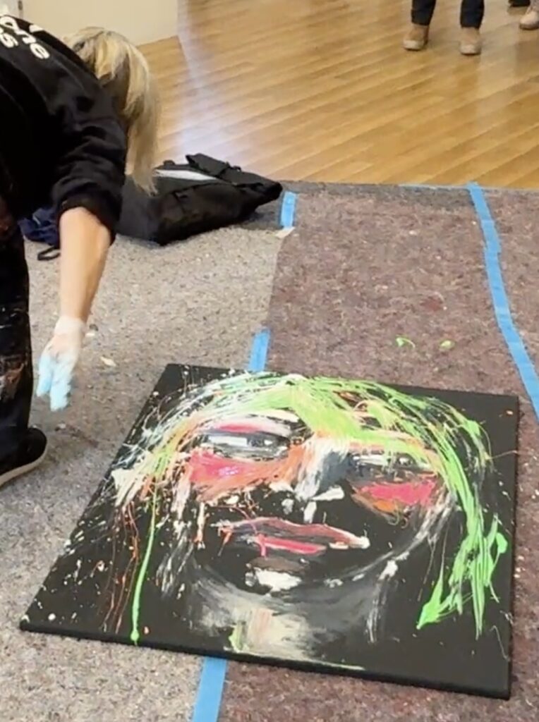 Éva Balogh, die seit vielen Jahren mit experimentellen Farbtechniken arbeitet, zeigte diese Methode gestern live. Ich filmte sie beim Live-Painting und sah, wie präzise sie den Farbwurf steuerte, und wie sicher sie die entstehenden Spuren weiterführte. So entstand aus vielen intuitiven Bewegungen ein Werk, das sowohl dynamisch als auch klar strukturiert wirkte.